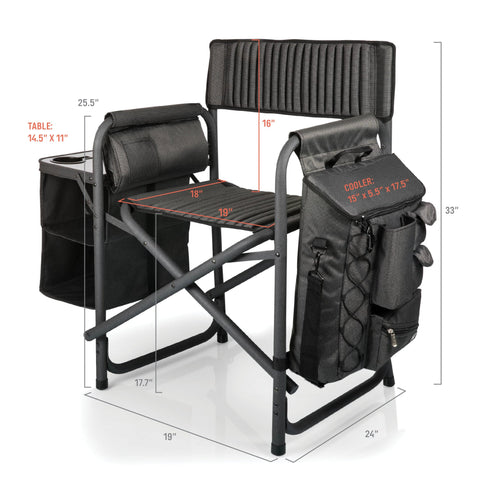 The Arkansas Razorbacks Fusion Camping Chair is a heavy duty portable camp chair with so many features, you might make it your new office! A durable, powder-coated aluminum frame and ribbed padding in the seat and back rests is only the beginning - this outdoor chair with table on the right side also includes a two-tiered, accordion-style shelves hanging below, plus a side-mounted, fully-detachable 24+1-can-capacity cooler with its own backpack straps, a cell-phone-specific pocket, specialized fabric loops for an umbrella or sports banner, and numerous pockets. The Fusion is more than an outdoor portable chair, it's a camp chair, a beach chair, and heck - a lawn chair relaxation throne. All that and it’s still lightweight enough to be easily portable yet strong enough to hold up to 350 lbs?! This is an outdoor directors chair that never disappoints.