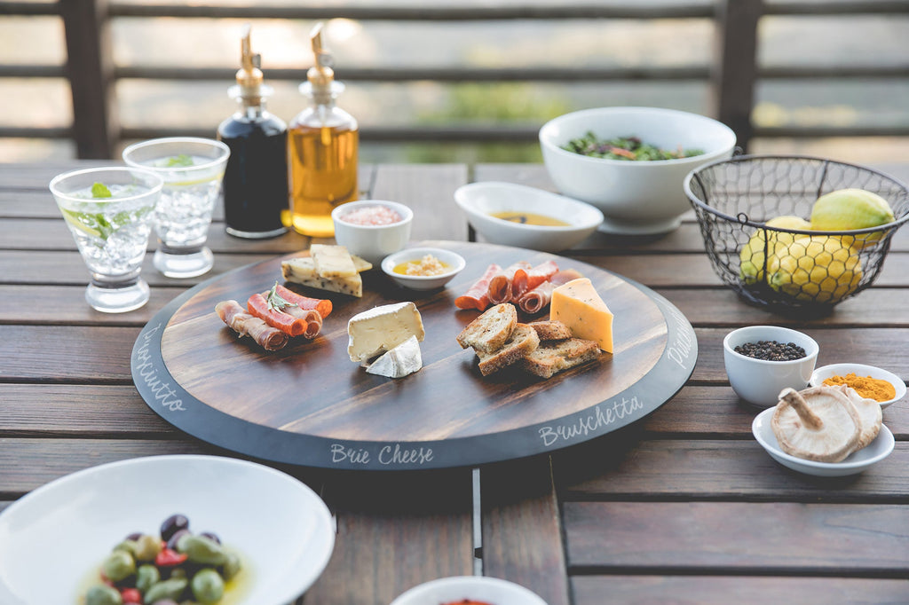 The centerpiece of every fine cocktail hour or wine & cheese tasting, the Lazy Susan is a circular, rotating serving tray made of fired acacia with a 1" tall chalkboard rim and included soapstone pencil for easy labeling. Your guests will love your presentation with this modern and refined serving platter.