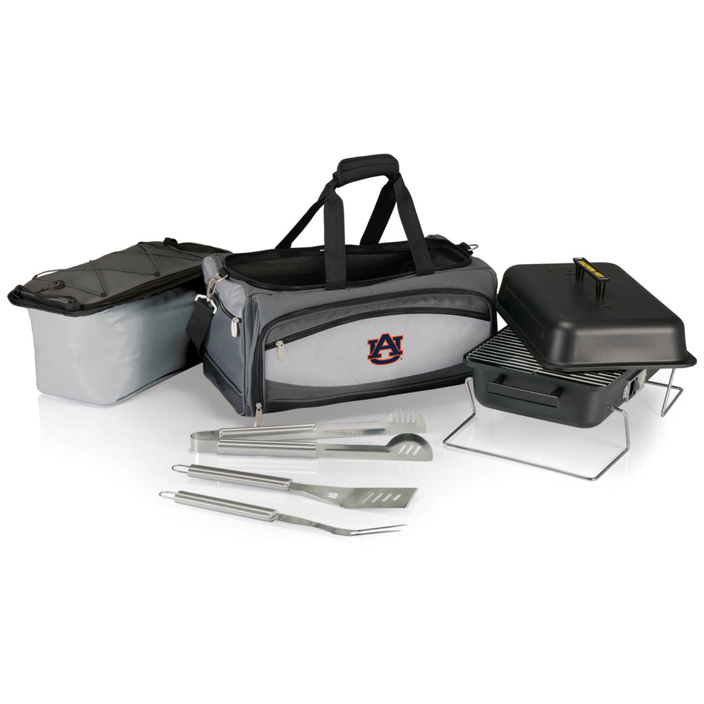 Picnic Time is proud to introduce our patented Auburn Tigers Buccaneer Portable Charcoal Grill & Cooler Tote, a travel grill set and insulated cooler in one! A 24-can capacity, fully-removable cooler nestles securely into the main compartment which holds the bbq grill and lid, and an exterior zip-up compartment holds three stainless steel grilling tools with aluminum handles and non-slip thumb grips including: one large spatula with an integrated bottle opener, one bbq fork, and tongs. With an adjustable shoulder strap with comfort pad, a reinforced waterproof base, three large zippered exterior pockets to store personal effects, padded carry handles, and a stretch cargo cord on the top of the tote to carry a blanket or towel, you'll win the tailgate party, hands down!