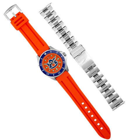 You’re no Fairweather Auburn Tigers fan, you’re a diehard who shows your pride every minute you can. That level of passion deserves an equally impressive timepiece that inspires your team spirit every second until game day. It’s time for the Auburn Tigers Men’s Contender watch from Sun Time. This Officially Licensed Men’s watch was designed for ultimate team spirit! It sports a bright team colored dial with the large team logo right in the center for maximum visibility. The Brushed finish 44mm Stainless Steel Case is accented with a team color rotating bezel timer, inner team color seconds bezel, and a durable mineral glass crystal. The case is accompanied by a 22mm brushed stainless steel bracelet with polished accenting and a secure deployment clasp. To top it all off, the Contender comes with an extra team color 22mm silicone strap, nicely packaged in a windowed gift box. You can have class; you can be…… a Contender!