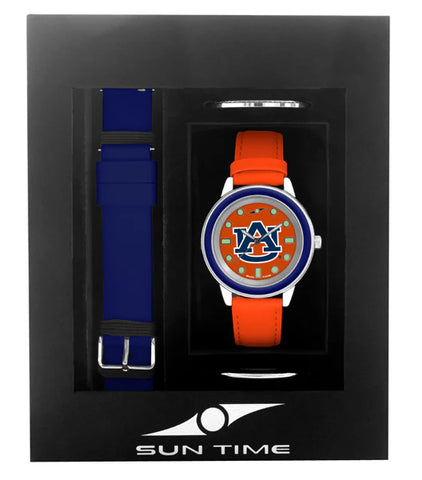 The Colors watch by Sun Time was designed specifically for tried & true Auburn Tigers fans! The 40mm Stainless Steel case features a bright team color dial displaying the large team logo right in the center for maximum visibility! Make it your own! The Colors features interchangeable bezels that allow you to swap the team colors to match your style, or add a little sparkly crystal bling and really make it pop! The removable bezels simply unscrew from the case of the watch, keeping it fast and easy whenever you feel like making a change.