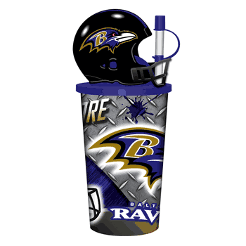 Great for tailgating or game day at home. This large reusable cup is decorated with your favorite Baltimore Ravens logo and topped with a helmet.