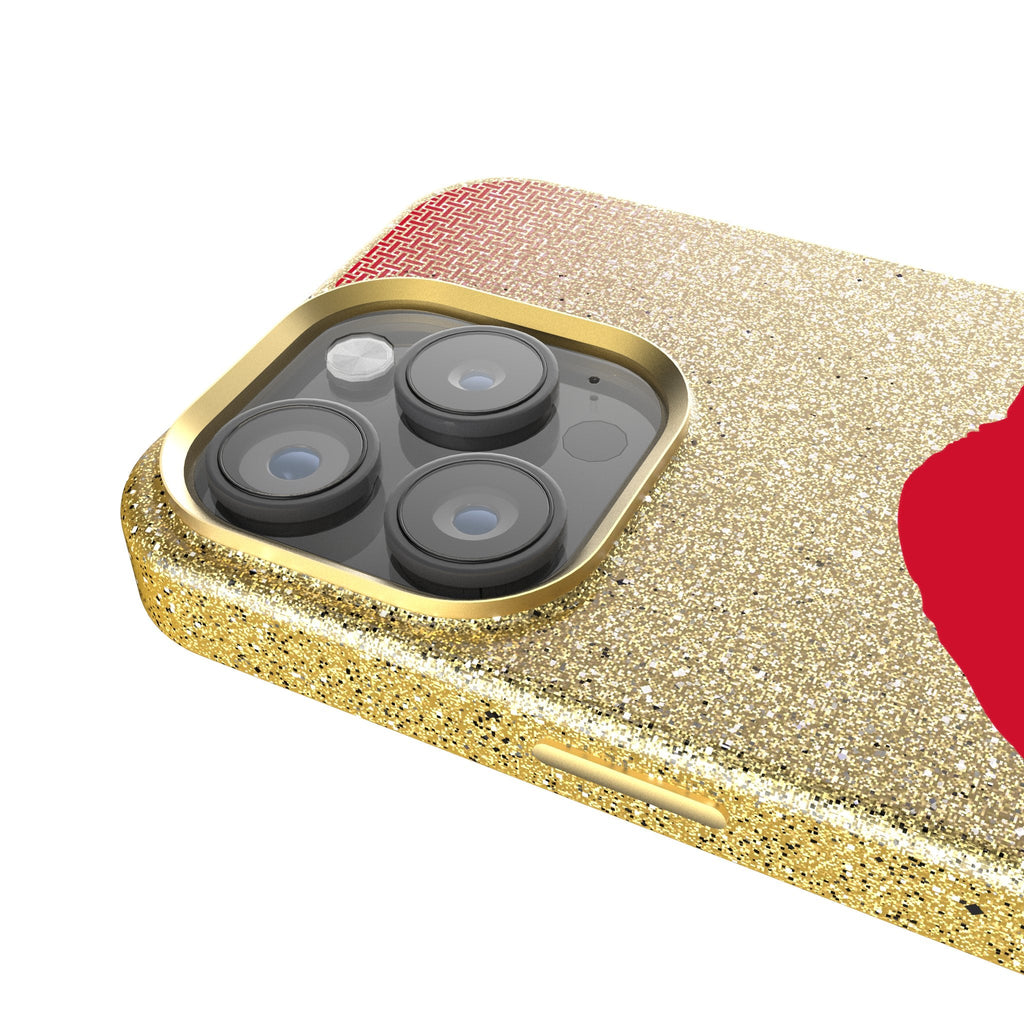 This gold, sparkly case with a microfiber interior is officially-licensed and MagSafe compatible. It provides fun and protection to your cell phone. Designed and decorated by Keyscaper in Tualatin, Oregon, USA., this case is exciting and durable. It has precise speaker and port cutouts, easy press buttons, and a raised lip around the screen and camera lens to provide extra protection against accidental bumps and scratches.