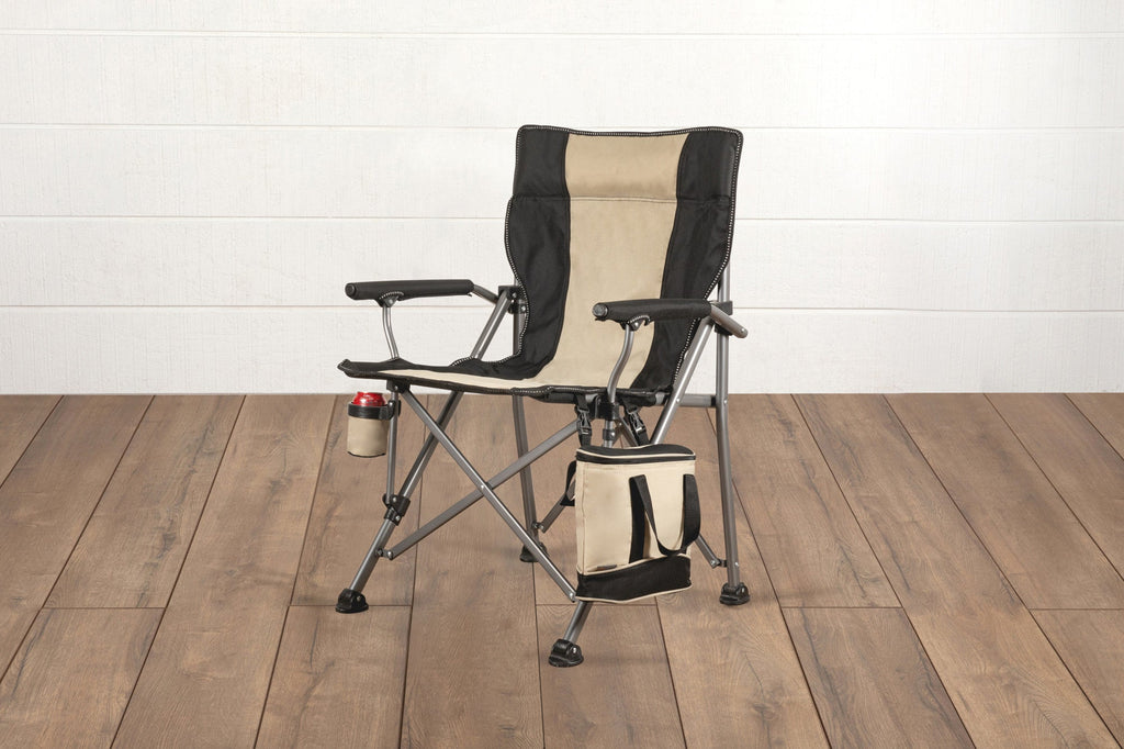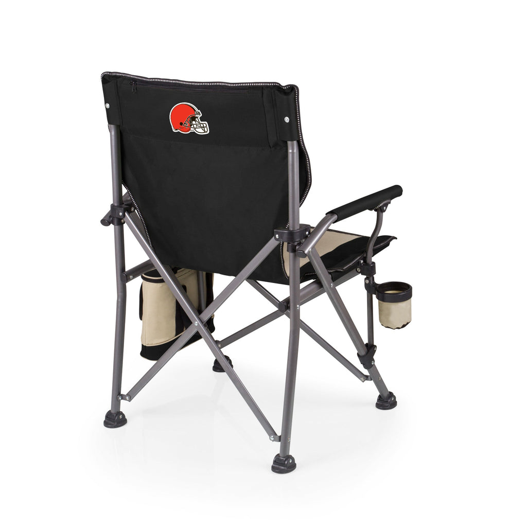 The Cleveland Browns Outlander XL Camping Chair with Cooler is a heavy duty beach chair with drink holder, cooler, and easy carry transport bag. This sturdy steel frame folding lawn chair features hinged feet for stability on uneven terrain, durable polyester canvas construction, and a 9-can-capacity cooler and drink holder that attach to the chair so your drinks are always within reach. Perfect for camping, picnicking, and tailgating, this portable outdoor chair packs into a drawstring tote with a shoulder strap and features a zippered security pocket behind the headrest. With a 400lb weight capacity, it’s a durable adult camping chair for everyone. Get a big value with a big folding sports chair. He ain’t heavy - he’s my camp chair!
