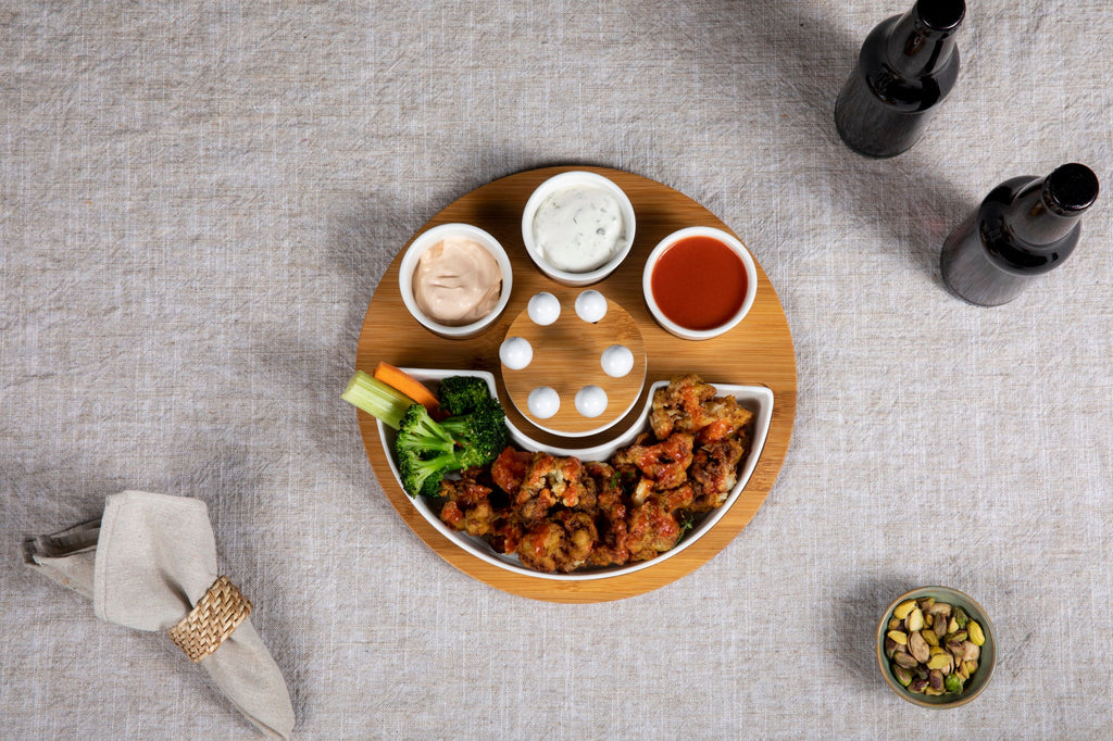 The Cleveland Browns Symphony Appetizer Serving Tray Set can help make any dinner party sing! With a bamboo appetizer plate featuring four ceramic dip bowls and six steel cocktail picks that fit into the top of the tray, this party platter set keeps your cheese & charcuterie chic & secure. The serving platter also features a large C-shaped white ceramic tray that is ideal for wings, meatballs, veggies, and more app favorites. Fill the ceramic bowls with your favorite cheeses, dips, or spreads, and your appetizer plate is complete with one easy-to-display tray! Hot tip: remove the center bowl to make this party tray look like a smiley face. :)