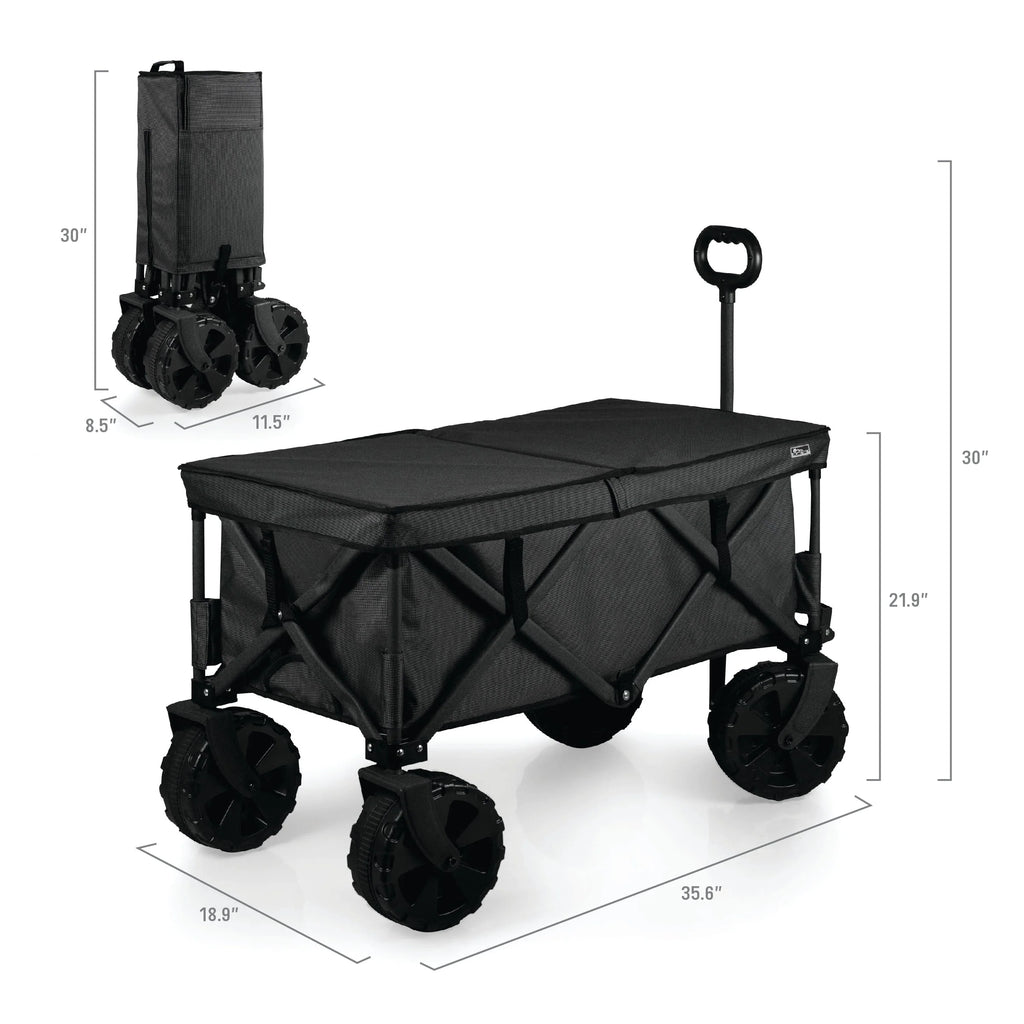 Save your back on and off road with the Adventure Wagon Elite All-Terrain Folding Beach Wagon with Big Wheels plus Table Top & Soft Cooler Liner, a sturdy utility wagon with endless uses, thoughtful accessories, and a rugged 225 weight capacity.