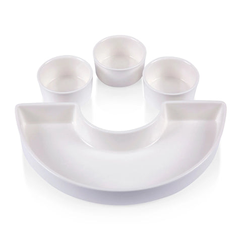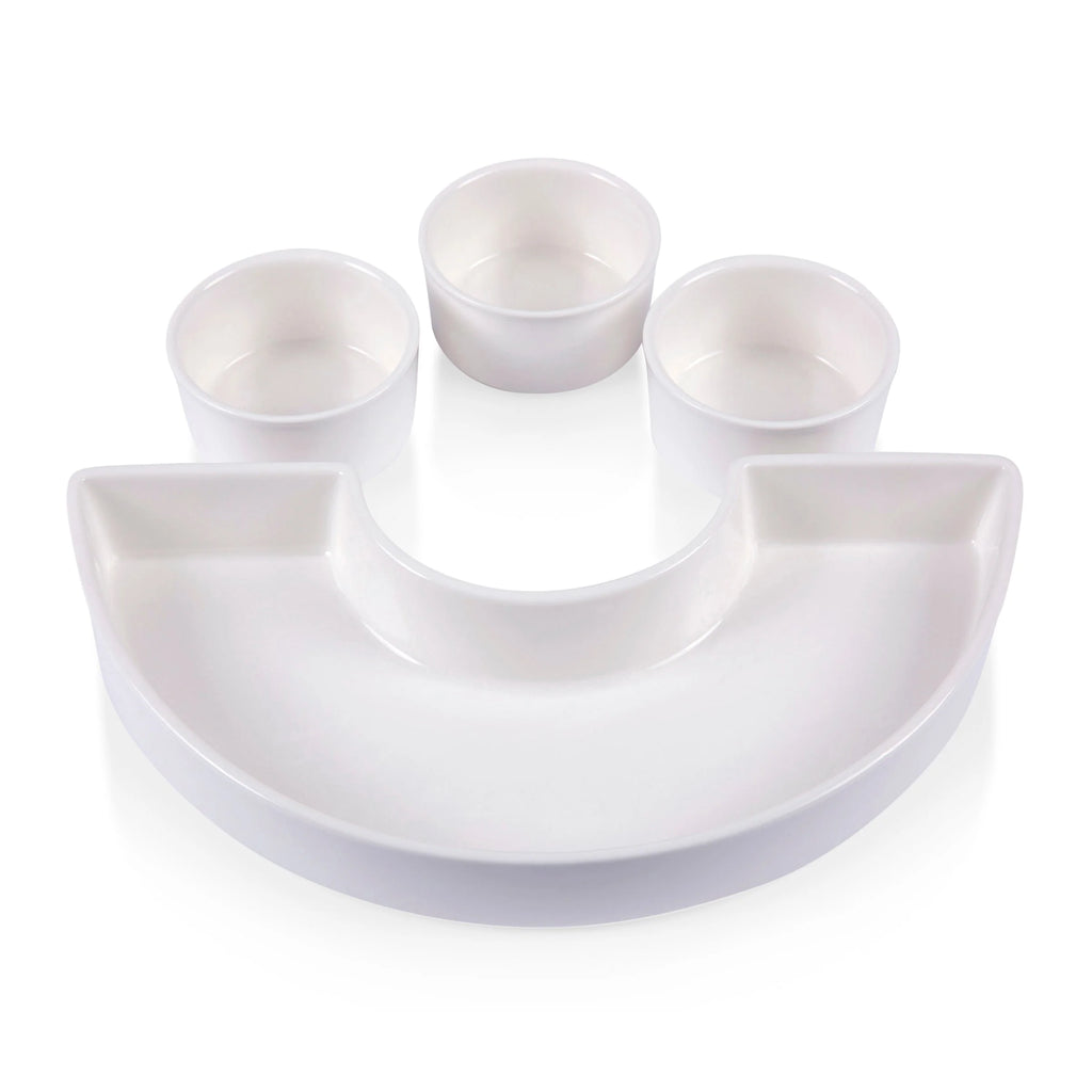 - Features three ceramic dip and spread bowls and six picks nestled inside a recessed bamboo tray