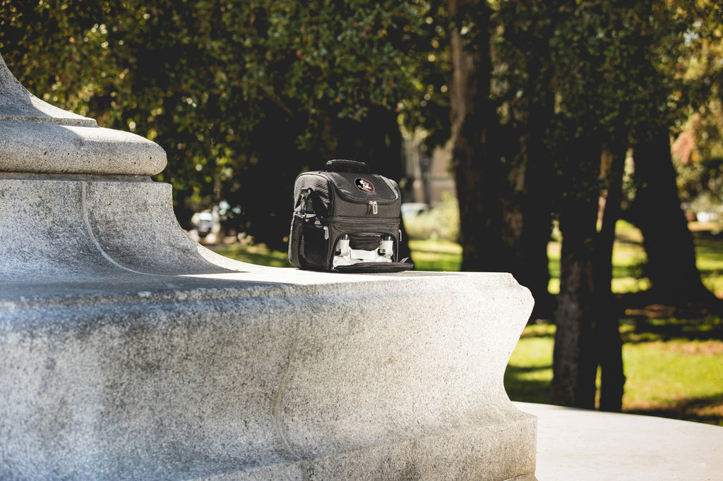 The Florida State Seminoles Pranzo Lunch Bag Cooler with Utensils is a high quality insulated lunch cooler for discerning men and women - after all, no matter your job, you gotta have lunch box! Level up your lunch with this insulated work cooler / lunch bag with top and bottom compartments to separate cold foods from warm/room temperature items. This polyester 8-can-capacity lunch cooler bag with an adjustable shoulder strap and grab-and-go handle also has a secret compartment containing stainless steel silverware, clear plastic salt & pepper shakers, and a 100% cotton napkin. Zippered mesh pockets on each side provide the perfect space for keys, wallets, or other essentials. The Pranzo is the all in one lunch box made for adults!