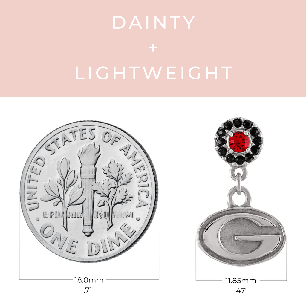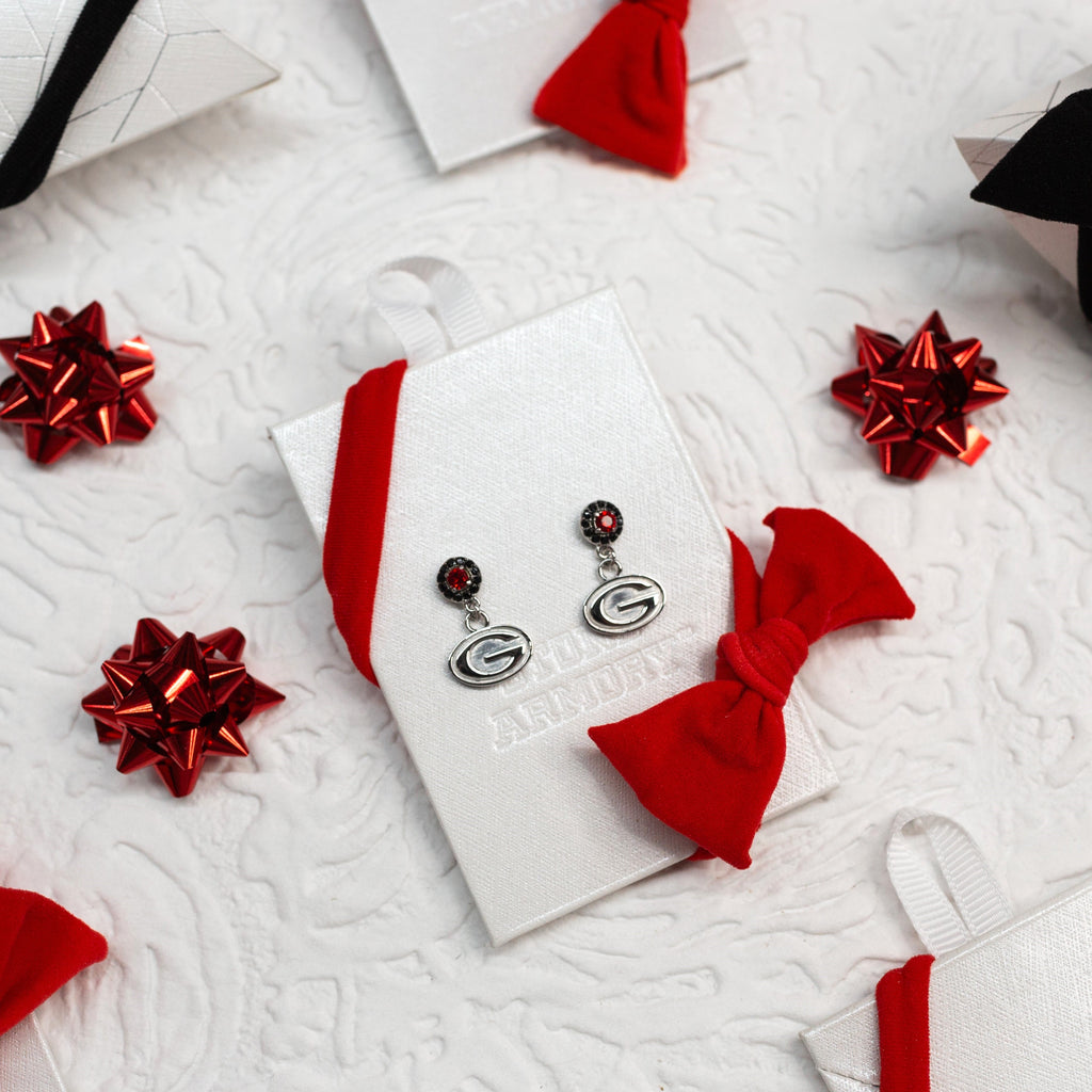 Stone Armory's Georgia crystal drop earrings are here! Gear up for game day with our beautifully designed Georgia Bulldogs earrings. Wear them to your next tailgate or around town to show off your University of Georgia pride. These stainless steel UGA earrings would also make the perfect Georgia gift for your favorite Georgia Bulldogs fan! The Georgia logo is accented by sparkling red and black crystals. Stone Armory's UGA jewelry is made of stainless steel and carefully designed, making these NCAA Georgia drop earrings the perfect gift to celebrate Georgia graduation, birthdays, Mother's Day, first day of school, the first Georgia game, or for everyday fan wear. Thank you for supporting our small business!