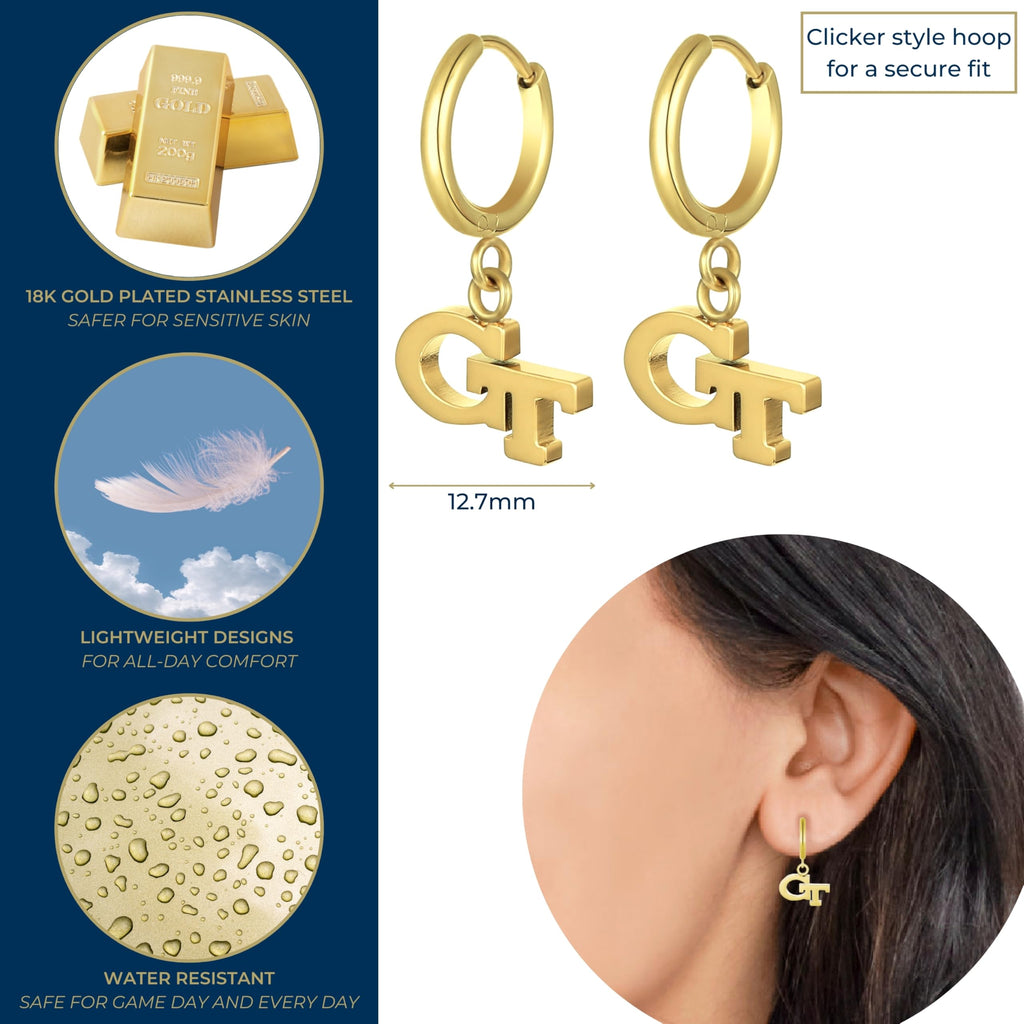 - The Ultimate Fit: These stainless steel Georgia Tech huggie hoop earrings provide all-day comfort and timeless style. Showcase your pride for the Georgia Tech Yellow Jackets with these elegant earrings, perfect for representing your school and team. Their delicate design makes them ideal for any occasion