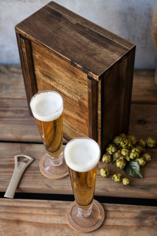 The handsome acacia wood and dovetail joinery of the Green Bay Packers Pilsner Beer Glass Gift Set with 2 Beer Glasses can stand alone on your bartop as an objet d'art - but under the sliding, removable panel is the real treat for beer lovers: two tall 12 oz fluted beer glasses, two real cork beverage coasters, and a deluxe bottle opener. This beer glass set brings back the ceremony of serving drinks and is a worthy craft beer gift for the discerning beer lover in your life. At home or on the go, give your favorite craft beers the elevated treatment they deserve with this deluxe beer drinker gift set.