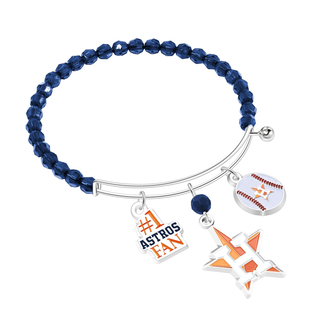 This Three Charm Logo Bangle Bracelet is adorned with three Houston Astros themed charms: #1 fan charm, full team color logo charm, football shaped charm with team wordmark. The durable tension clasp ensures care-free wear, so no need to worry it will fall off when cheering for your team as they score!