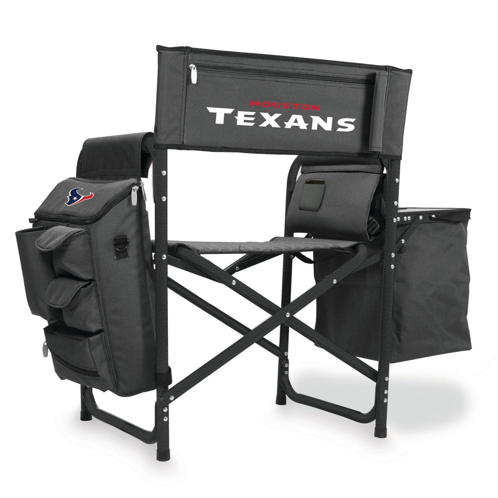 The Houston Texans Fusion Camping Chair is a heavy duty portable camp chair with so many features, you might make it your new office! A durable, powder-coated aluminum frame and ribbed padding in the seat and back rests is only the beginning - this outdoor chair with table on the right side also includes a two-tiered, accordion-style shelves hanging below, plus a side-mounted, fully-detachable 24+1-can-capacity cooler with its own backpack straps, a cell-phone-specific pocket, specialized fabric loops for an umbrella or sports banner, and numerous pockets. Show off your team spirit everywhere you go with this chair, adorned with your favorite team's logo across the back and cooler. The Fusion is more than an outdoor portable chair, it's a camp chair, a beach chair, and heck - a lawn chair relaxation throne. All that and it’s still lightweight enough to be easily portable yet strong enough to hold up to 350 lbs?! This is an outdoor directors chair that never disappoints.