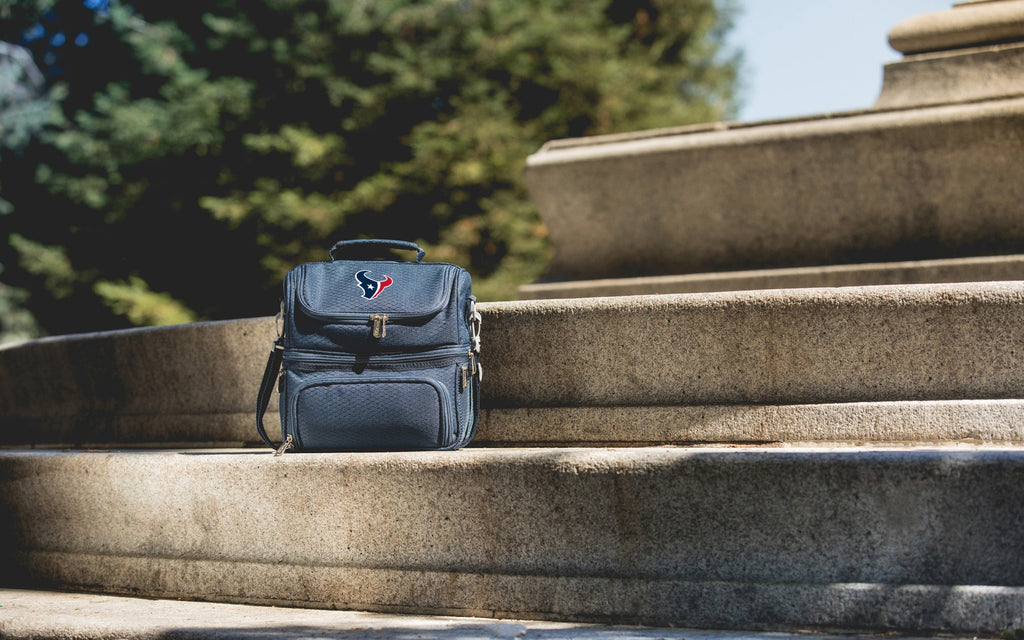 The Houston Texans Pranzo Lunch Bag Cooler with Utensils is a high quality insulated lunch cooler for discerning men and women - after all, no matter your job, you gotta have lunch box! Level up your lunch with this insulated work cooler / lunch bag with top and bottom compartments to separate cold foods from warm/room temperature items. This polyester 8-can-capacity lunch cooler bag with an adjustable shoulder strap and grab-and-go handle also has a secret compartment containing stainless steel silverware, clear plastic salt & pepper shakers, and a 100% cotton napkin. Zippered mesh pockets on each side provide the perfect space for keys, wallets, or other essentials. The Pranzo is the all in one lunch box made for adults!