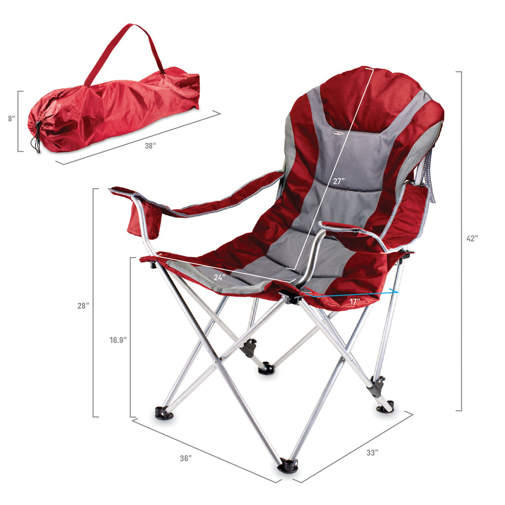 Plush, portable, and packable, the Picnic Time Houston Texans Reclining Camp Chair is your camping cockpit with three reclining positions, an extra-wide, padded polyester seat and armrests, an insulated drink holder, a zippered pocket, and a sturdy steel frame that folds inward to fit in a drawstring carrying bag with carrying strap. Show off your team spirit everywhere you go with this chair, adorned with your favorite team's logo across the back. This folding outdoor portable chair is the perfect place to post up for camping, picnicking, tailgating, or at the beach. If it’s outdoors, this is portable chair that will get you there. “There” being...comfy? Sure.