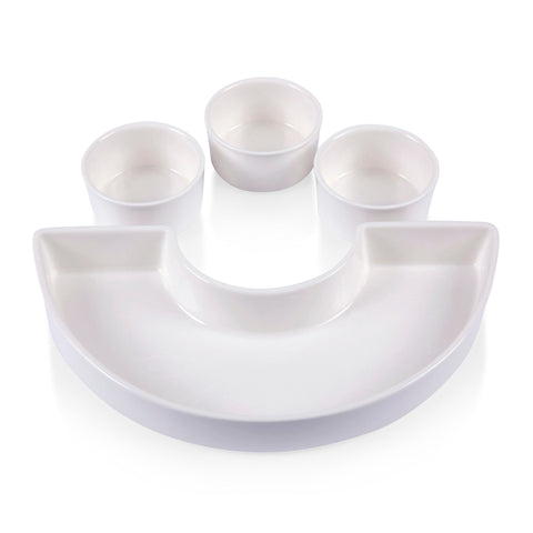 The Houston Texans Symphony Appetizer Serving Tray Set can help make any dinner party sing! With a bamboo appetizer plate featuring four ceramic dip bowls and six steel cocktail picks that fit into the top of the tray, this party platter set keeps your cheese & charcuterie chic & secure. The serving platter also features a large C-shaped white ceramic tray that is ideal for wings, meatballs, veggies, and more app favorites. Fill the ceramic bowls with your favorite cheeses, dips, or spreads, and your appetizer plate is complete with one easy-to-display tray! Hot tip: remove the center bowl to make this party tray look like a smiley face. :)