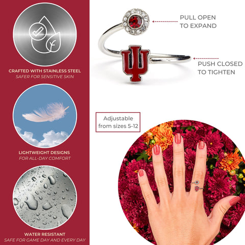 - ❤️THE PERFECT Indiana University GIFT: This Hoosiers ring is adjustable in size and will fit most, making it the perfect womens gift for yourself, Indiana fans, graduates, students, moms, sisters, daughters and Indiana alumni. Great gift for Mother's Day, Christmas, birthdays and graduation.