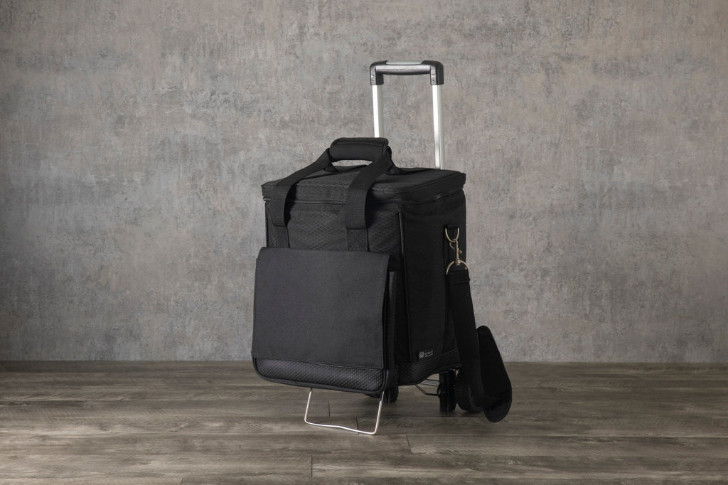 Know what rhymes with stellar? Cellar! As in the Cellar 6-Bottle Wine Carrier & Cooler Tote, a fully-insulated and portable wine tote with a 6-bottle, removable divider and an extra-large exterior gusseted pocket for added storage. A durable ripstop exterior, water resistant interior liner, Thermoguard insulation, and a pearlized foil lid keep your wine and food safe and at the desired temperature on your journeys. Use the adjustable shoulder strap with movable pad for transport, or use the chromed, heavy-duty foldable luggage trolley with 4" all-terrain wheels that conveniently slips into the backside of this rolling cooler.