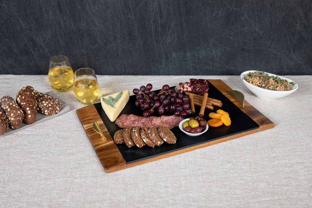 You love charcuterie, we love charcuterie, and for those people in your life that have never been blessed with it, you'll want their first time to be on the Covina Serving Tray. The Covina has a modern look with soft rounded edges on the acacia wood tray, and a removable slate serving board. This beautiful tray has four foam feet on the bottom side so that your meats and cheeses will stay safely where you set them, and the whole thing is easily carried around by the two rounded satin brass-toned handles. If you're going to a party, hosting one, or enjoying a Friday night mixer for one, knock up the taste and style with the Covina Serving Tray, because everything is better on slate.