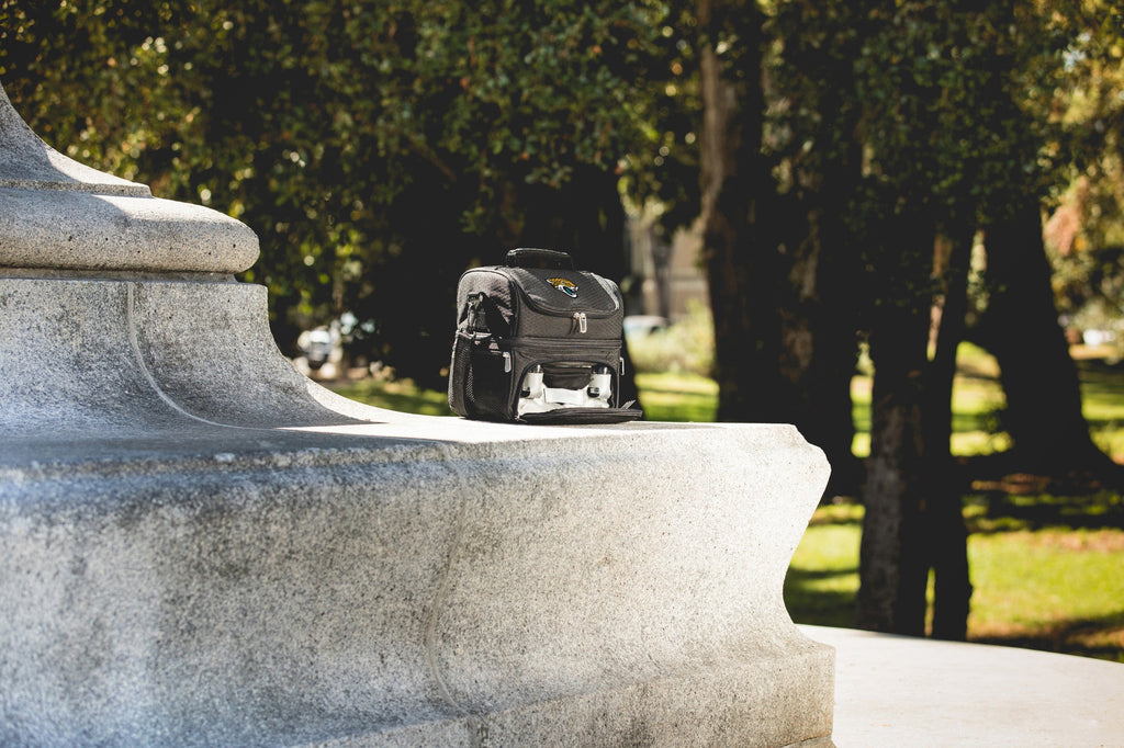 The Jacksonville Jaguars Pranzo Lunch Bag Cooler with Utensils is a high quality insulated lunch cooler for discerning men and women - after all, no matter your job, you gotta have lunch box! Level up your lunch with this insulated work cooler / lunch bag with top and bottom compartments to separate cold foods from warm/room temperature items. This polyester 8-can-capacity lunch cooler bag with an adjustable shoulder strap and grab-and-go handle also has a secret compartment containing stainless steel silverware, clear plastic salt & pepper shakers, and a 100% cotton napkin. Zippered mesh pockets on each side provide the perfect space for keys, wallets, or other essentials. The Pranzo is the all in one lunch box made for adults!