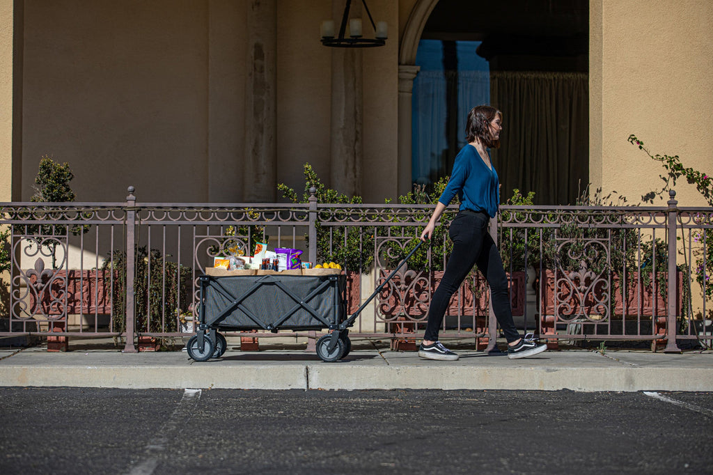 Save your back with the Adventure Wagon Folding Wagon, a sturdy utility wagon with endless uses and a rugged 225 lb weight capacity. With a powder-coated steel frame and durable two-tone polyester canvas for hauling everything you need, this all terrain folding collapsible wagon can take you everywhere from beach picnics to camping to shopping for groceries at your local farmer’s market. This beach wagon packs away compactly, sets up easily, and has a telescoping handle for ease of use. A zippered, hanging storage pocket inside the cart is perfect for your phone and other delicate items. Is there anywhere this sport utility wagon can’t go?! Well, we can't think of anywhere!