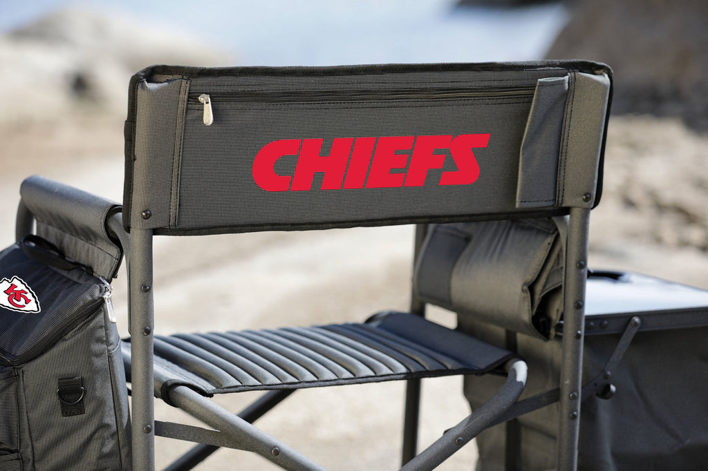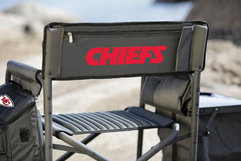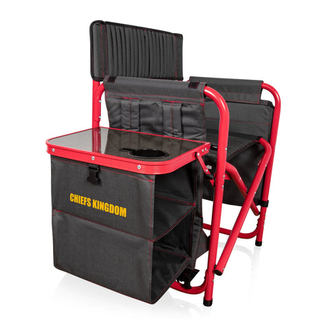 The Kansas City Chiefs Fusion Camping Chair is a heavy duty portable camp chair with so many features, you might make it your new office! A durable, powder-coated aluminum frame and ribbed padding in the seat and back rests is only the beginning - this outdoor chair with table on the right side also includes a two-tiered, accordion-style shelves hanging below, plus a side-mounted, fully-detachable 24+1-can-capacity cooler with its own backpack straps, a cell-phone-specific pocket, specialized fabric loops for an umbrella or sports banner, and numerous pockets. Show off your team spirit everywhere you go with this chair, adorned with your favorite team's logo across the back and cooler. The Fusion is more than an outdoor portable chair, it's a camp chair, a beach chair, and heck - a lawn chair relaxation throne. All that and it’s still lightweight enough to be easily portable yet strong enough to hold up to 350 lbs?! This is an outdoor directors chair that never disappoints.
