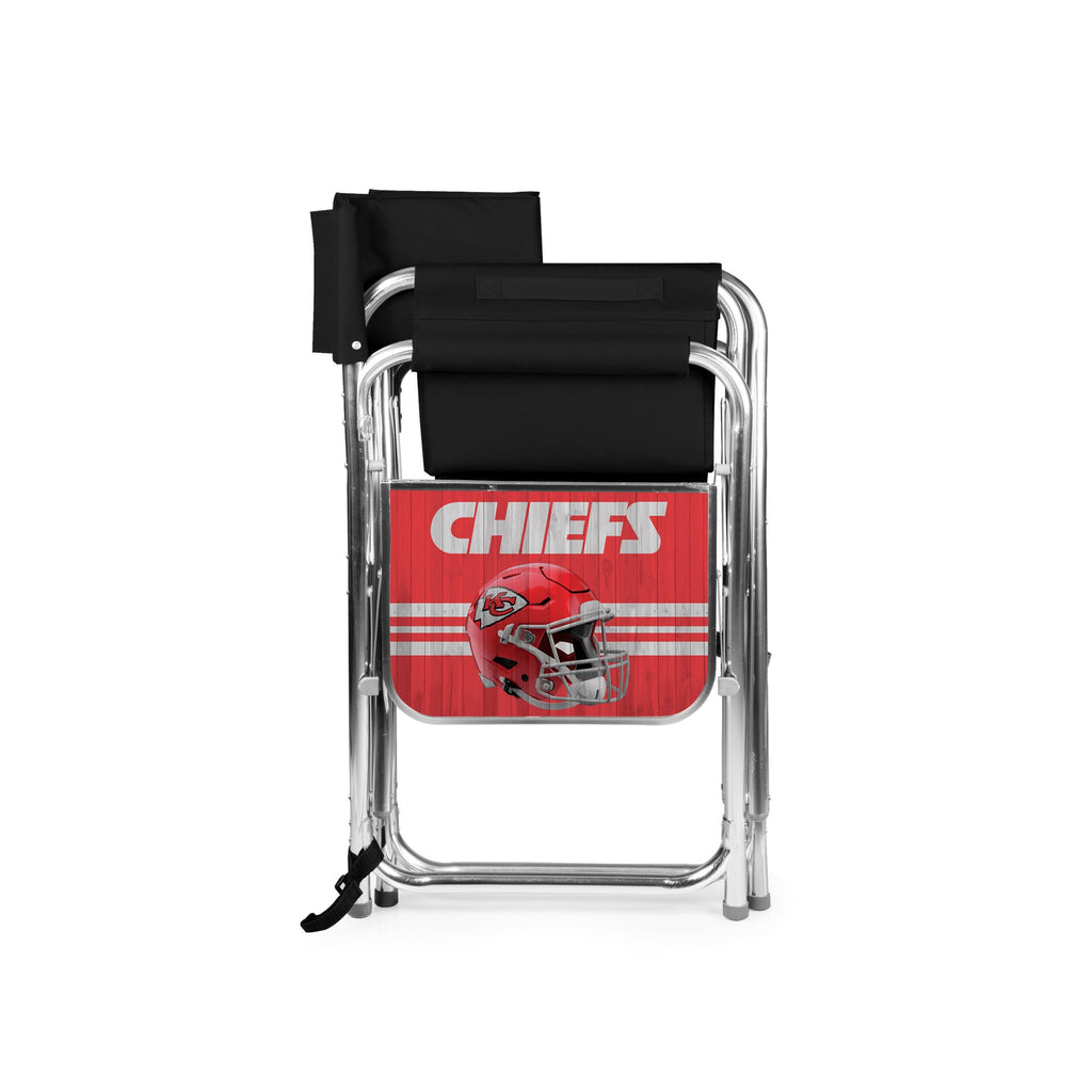 Show your team spirit year round - the Kansas City Chiefs Sports Chair with Side Table is the last and greatest portable outdoor folding chair you’ll ever need. With classic lines and modern touches, this smart travel chair made of durable polyester canvas on a foldable and lightweight aluminum frame is the deluxe folding chair you deserve. Your seat is extra-wide (19.5") and made of durable 600D polyester, so you know it’s built to last. Features abound on this lawn and picnic-ready directors chair with padded seat and armrests, fold-out side table, hanging armrest caddy for holding books & magazines, two insulated beverage pockets, and a variety of additional pockets for extras. Grab-and-go with the underseat carrying handles or use the adjustable, detachable shoulder strap for longer treks to the campsite, the beach, or across the stadium. This outdoor camping chair is ideal for camping, picnicking, concerts in the park, or watching your favorite sport comfortably from the sidelines. Your companions may be melting in the summer heat, but you've got shade for days with the Oniva Beach Umbrella (sold separately) attached to the built-in umbrella loop. But there’s no need to gloat - this outdoor camping chair does all the bragging for you without saying a word. Adorned with your favorite team logo on the back of the chair and a decorated tabletop no one will mistake who you're cheering for this season.