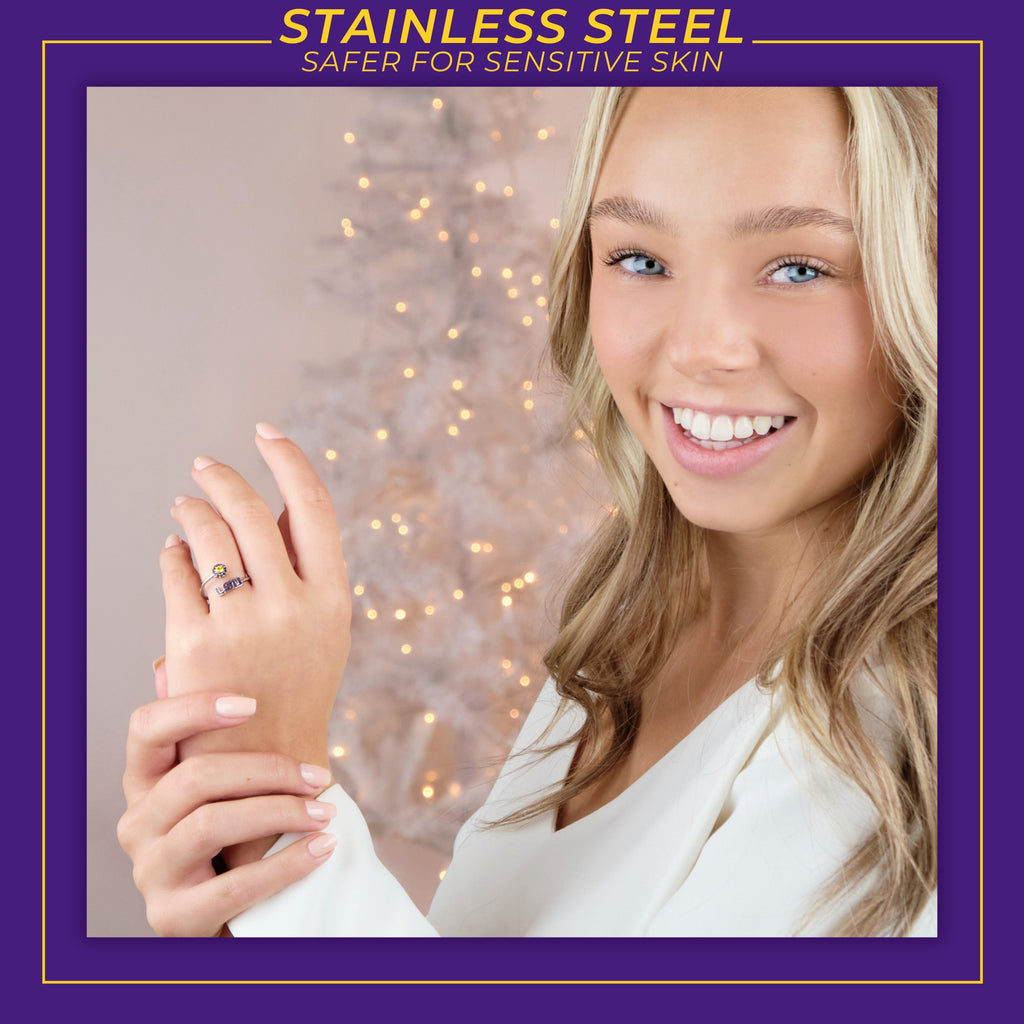 Stone Armory's Louisiana State ring is finally here! Gear up for the game with our beautifully designed Louisiana State Tigers ring! Wear it to the next tailgate or around town to show off your Louisiana State University pride. This adjustable LSU ring would also make the perfect Louisiana State gift for your favorite LSU Tigers fan! The Louisiana State logo is accented by sparkling purple and yellow crystals. Stone Armory's LSU jewelry is made of stainless steel and is adjustable in size, making this NCAA Louisiana State ring the perfect gift to celebrate Louisiana State graduation, birthdays, Mother's Day, first day of school, the first game, or for everyday fan wear. Thank you for supporting our small business!