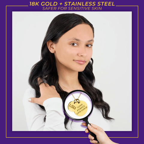 Proudly display your LSU Tigers pride with this officially licensed LSU necklace, featuring two gold-plated pendants engraved with the iconic LSU logo and the inspiring mantra, 'Love Purple Live Gold This pendant necklace, made from surgical-grade stainless steel and coated in 18K gold, offers both durability and elegance. Its adjustable length (16-20 inches) makes it perfect for everyday wear or LSU game day. Whether you're attending a game or gifting it for a special occasion, this necklace is ideal for LSU fans, students, and alumni. It makes a thoughtful present for birthdays, Mother’s Day, graduations, Christmas, any other celebration. Packaged simply yet beautifully, this necklace arrives ready for gifting, ensuring it will delight any LSU fan