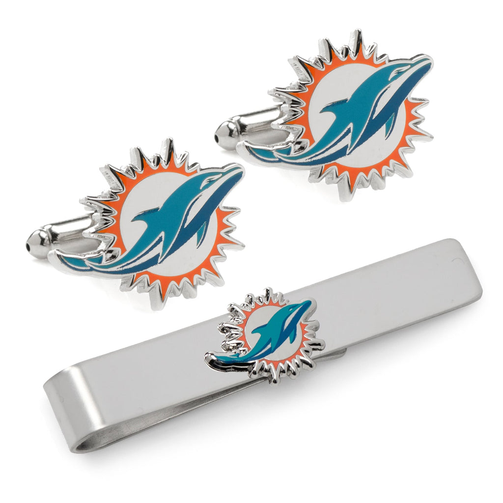 The perfect gift for the dapper football fan, this gift set combines officially licensed Miami Dolphins cufflinks and a matching tie bar. Great for the businessman whose everyday attire consists of a suit and tie, help him represent his team with elegant accessories that won't damper his look. Elevate your style with the Miami Dolphins Cufflinks and Tie Bar Gift Set. Officially licensed by the NFL.