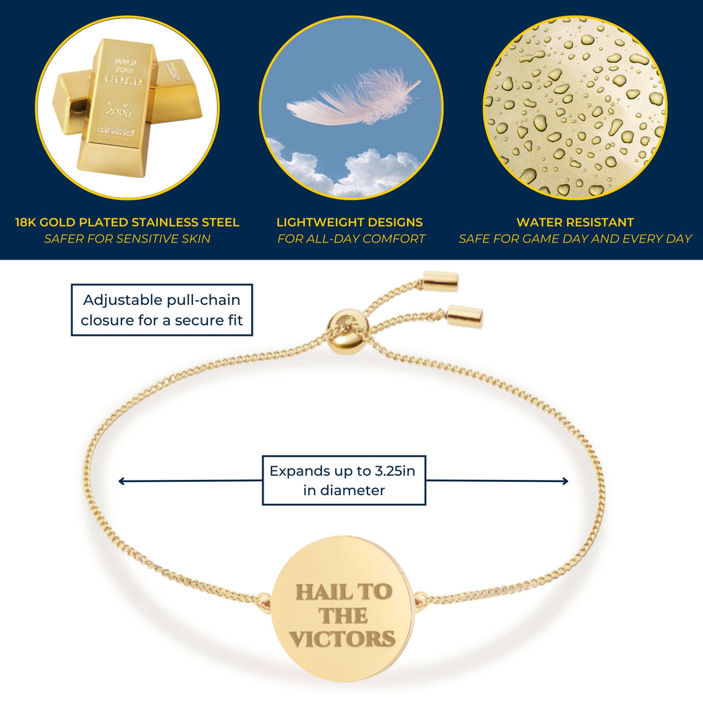 Elevate your style with our University of Michigan Wolverines bracelet, exquisitely crafted with 18K gold plated stainless steel and meticulously designed to offer Michigan Wolverines elegance and durability. This stunning Michigan bracelet is the perfect accessory for any occasion, blending timeless style with modern sophistication. Our Wolverines Jewelry offers an adjustable design, ensuring a perfect fit for everyone and allowing you to choose a snug or loose fit according to your preference. This Michigan bracelet is also great for stacking and layering! Made from high-quality 18K gold plated stainless steel, this bracelet is safe for sensitive skin, offering visual luxury without any irritation. Each Wolverines bracelet is designed to maintain its shine with long-lasting beauty and durability. The sleek and elegant design makes it a versatile piece that complements any outfit and especially Michigan Wolverines Apparel, from casual to formal wear to Michigan Wolverines Football Gamedays, showcase your Michigan Wolverines pride. Featuring a secure pull chain closure, you can wear your bracelet with confidence, knowing it will stay in place all day long. This adjustable bolo chain bracelet captures the spirit and tradition of The University of Michigan with the iconic engraved 'Hail to the Victors' charm design. Ready to gift, our UM jewelry comes in beautiful, elegant packaging and a bow, making perfect Wolverines Gifts for women, Michigan Birthday Gifts, Graduation Gifts, Michigan Alumni Gifts, back-to-school, or anyone that is a University of Michigan fan. Enjoy the ease of maintaining your bracelet with simple cleaning, ensuring it remains radiant and beautiful for years to come. With its classic design, this Michigan bracelet transcends trends, offering a timeless piece that you'll cherish forever. Go Blue!