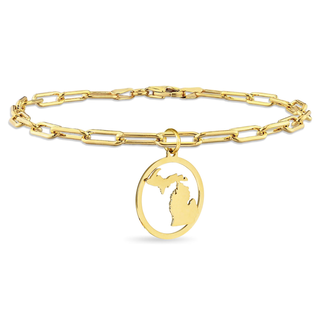 Wear your Michigan pride on your wrist with this modern paperclip chain bracelet featuring a detailed Michigan state charm. Crafted from durable stainless steel and finished in rich 18K gold PVD, this bracelet is tarnish-resistant, hypoallergenic, and built for everyday wear. Whether you're a proud Michigander or shopping for a thoughtful gift, this waterproof bracelet is a beautiful tribute to the Great Lakes State.