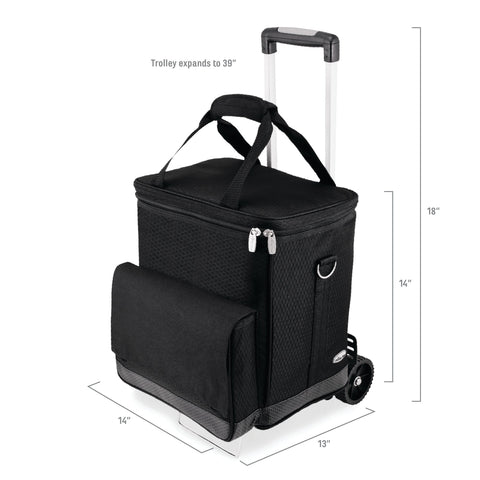 Know what rhymes with stellar? Cellar! As in the Cellar 6-Bottle Wine Carrier & Cooler Tote, a fully-insulated and portable wine tote with a 6-bottle, removable divider and an extra-large exterior gusseted pocket for added storage. A durable ripstop exterior, water resistant interior liner, Thermoguard insulation, and a pearlized foil lid keep your wine and food safe and at the desired temperature on your journeys. Use the adjustable shoulder strap with movable pad for transport, or use the chromed, heavy-duty foldable luggage trolley with 4" all-terrain wheels that conveniently slips into the backside of this rolling cooler.