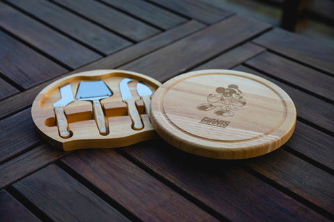 The Mickey New York Giants Circo Cheese Board & Knife Set makes brilliant and attractive use of limited space with a split-level wood charcuterie board and interior cheese set. What makes it such a Disney-meets-NFL MVP? Made from eco-friendly parawood, this cheese board's cutting surface swivels open to reveal contains four brushed stainless steel cheese tools including: one cheese cleaver (for crumbly cheeses), one cheese planer (for semi-hard to hard cheese slices), one fork-tipped cheese knife, and one hard cheese knife/spreader. This wood cutting board also features a recessed juice groove to catch cheese brine or juice from cut fruit - and Mickey Mouse playing QB for your favorite NFL team! Whether you're entertaining at home or taking it on the road as a picnic cheese board set, you can show off your NFL fandom and Disney devotion with this unique conversation piece.