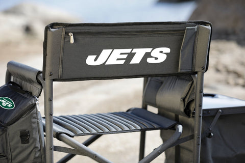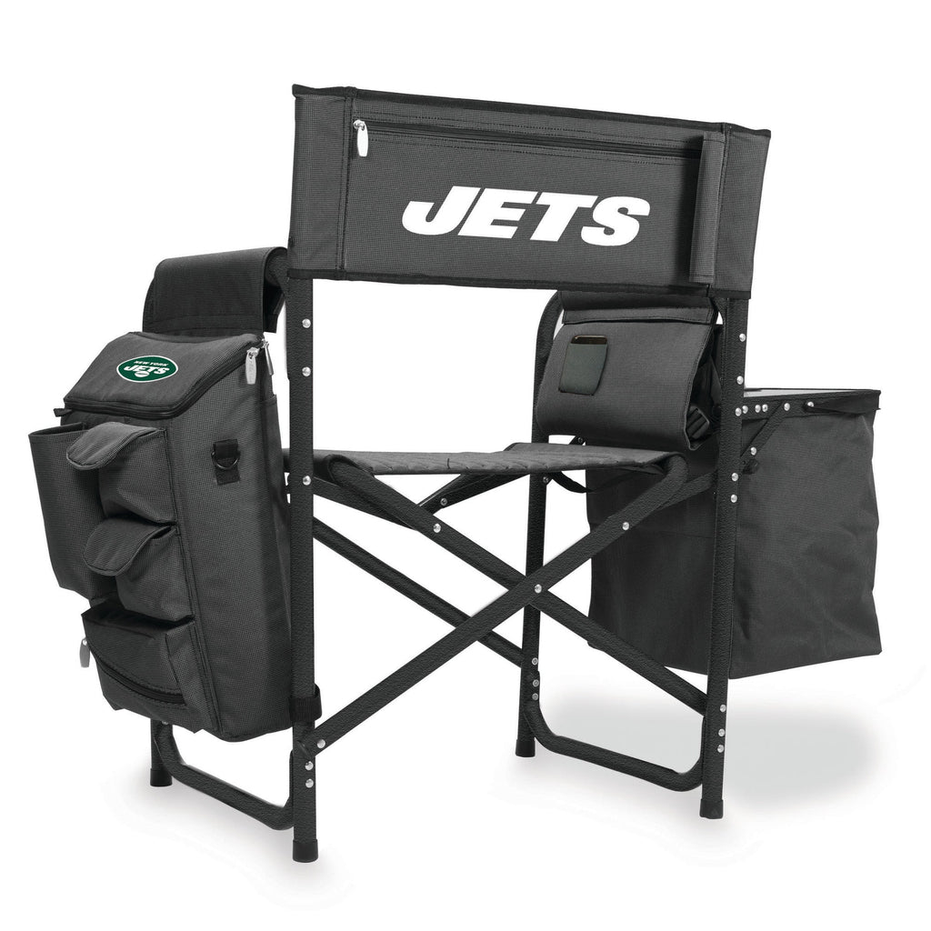 The New York Jets Fusion Camping Chair is a heavy duty portable camp chair with so many features, you might make it your new office! A durable, powder-coated aluminum frame and ribbed padding in the seat and back rests is only the beginning - this outdoor chair with table on the right side also includes a two-tiered, accordion-style shelves hanging below, plus a side-mounted, fully-detachable 24+1-can-capacity cooler with its own backpack straps, a cell-phone-specific pocket, specialized fabric loops for an umbrella or sports banner, and numerous pockets. Show off your team spirit everywhere you go with this chair, adorned with your favorite team's logo across the back and cooler. The Fusion is more than an outdoor portable chair, it's a camp chair, a beach chair, and heck - a lawn chair relaxation throne. All that and it’s still lightweight enough to be easily portable yet strong enough to hold up to 350 lbs?! This is an outdoor directors chair that never disappoints.
