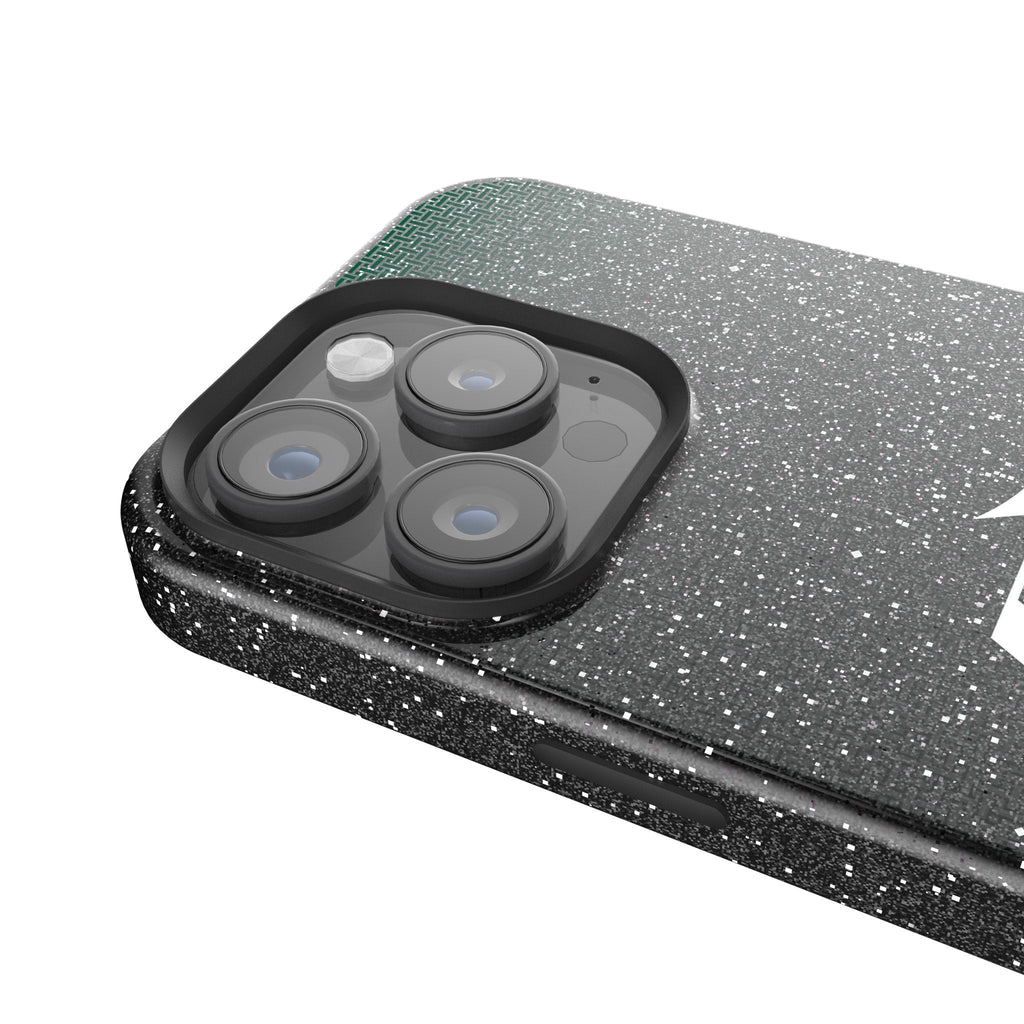 This black, sparkly case with a microfiber interior is officially-licensed and MagSafe compatible. It provides fun and protection to your cell phone. Designed and decorated by Keyscaper in Tualatin, Oregon, USA., this case is exciting and durable. It has precise speaker and port cutouts, easy press buttons, and a raised lip around the screen and camera lens to provide extra protection against accidental bumps and scratches.