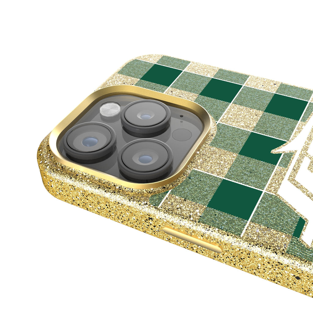 This gold, sparkly case with a microfiber interior is officially-licensed and MagSafe compatible. It provides fun and protection to your cell phone. Designed and decorated by Keyscaper in Tualatin, Oregon, USA., this case is exciting and durable. It has precise speaker and port cutouts, easy press buttons, and a raised lip around the screen and camera lens to provide extra protection against accidental bumps and scratches.
