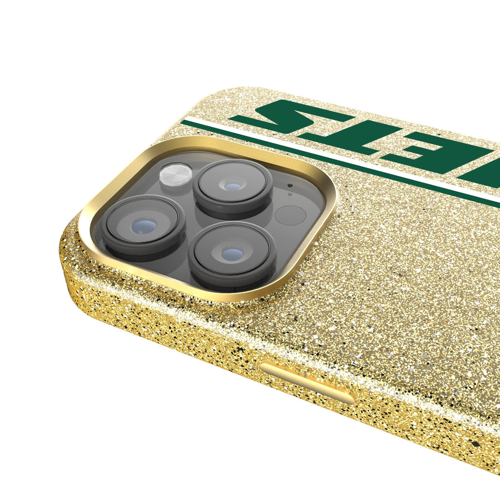 This gold, sparkly case with a microfiber interior is officially-licensed and MagSafe compatible. It provides fun and protection to your cell phone. Designed and decorated by Keyscaper in Tualatin, Oregon, USA., this case is exciting and durable. It has precise speaker and port cutouts, easy press buttons, and a raised lip around the screen and camera lens to provide extra protection against accidental bumps and scratches.