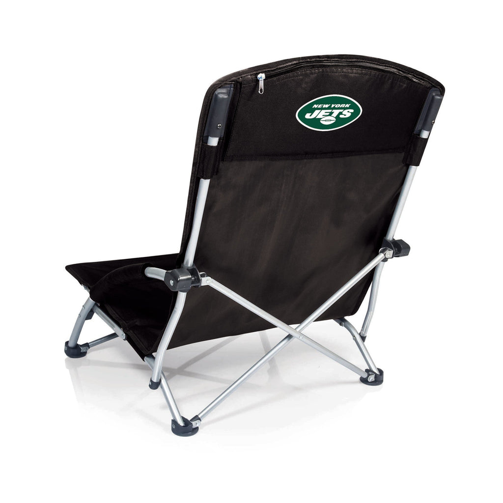Pillowy, portable, and packable - the New York Jets Tranquility Beach Chair with Carry Bag is an outdoor low camp chair ideal for camping, picnics, and beach days! Made from durable polyester canvas stretched on a lightweight, powder-coated steel frame, this low beach chair folds inwardly to fit neatly into a drawstring carrying bag with a shoulder strap. Treat yourself to the best of beach days with camping chair accents like the cushioned headrest and the zippered security pocket in the back of it. This chair may be low, but it’s functional lounge chair design, super comfortable recline, and easy fold-up for travel and storage make it built to raise your spirits! With gear this good, you'll be spending even more time outdoors.
