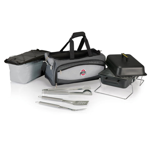 Picnic Time is proud to introduce our patented Ohio State Buckeyes Buccaneer Portable Charcoal Grill & Cooler Tote, a travel grill set and insulated cooler in one! A 24-can capacity, fully-removable cooler nestles securely into the main compartment which holds the bbq grill and lid, and an exterior zip-up compartment holds three stainless steel grilling tools with aluminum handles and non-slip thumb grips including: one large spatula with an integrated bottle opener, one bbq fork, and tongs. With an adjustable shoulder strap with comfort pad, a reinforced waterproof base, three large zippered exterior pockets to store personal effects, padded carry handles, and a stretch cargo cord on the top of the tote to carry a blanket or towel, you'll win the tailgate party, hands down!