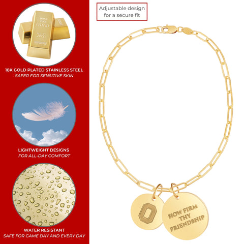 How Firm Thy Friendship - Elevate your style with our Ohio State University Buckeyes bracelet, exquisitely crafted with Stainless Steel + 18K Gold Plate and meticulously designed to offer Ohio State Buckeyes elegance and durability. This stunning Ohio State bracelet is the perfect accessory for any occasion, blending timeless style with modern sophistication. Our Buckeyes Jewelry offers an adjustable design, ensuring a perfect fit for everyone and allowing you to choose a snug or loose fit according to your preference. This Ohio State bracelet is also great for stacking and layering! Made from high-quality stainless steel with 18K gold plating, this bracelet is safe for sensitive skin, offering the luxury of gold without any irritation. Each Buckeyes bracelet is designed to maintain its shine with long-lasting beauty and durability. The sleek and elegant design makes it a versatile piece that complements any outfit and especially Ohio State Buckeyes Apparel, from casual to formal wear to Ohio State Buckeyes Football Gamedays, showcase your Ohio State Buckeyes pride. Featuring a secure clasp, you can wear your bracelet with confidence, knowing it will stay in place all day long. This Charm Bracelet captures the spirit and tradition of The Ohio State University with the iconic slogan 'How Firm Thy Friendship' emblazoned on it. Ready to gift, our OSU jewelry comes in beautiful, elegant packaging and a bow, making perfect Buckeyes Gifts for women, Ohio State Birthday Gifts, Graduation Gifts, Ohio State Alumni Gifts, back-to-school, or anyone that is a Ohio State University fan. Enjoy the ease of maintaining your bracelet with simple cleaning, ensuring it remains radiant and beautiful for years to come. With its classic design, this Ohio State Charm Bracelet transcends trends, offering a timeless piece that you'll cherish forever. Let's Go Bucks!