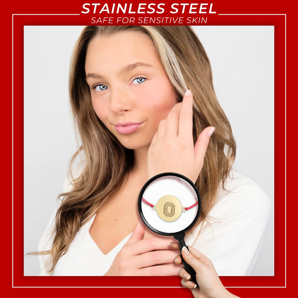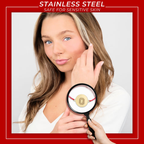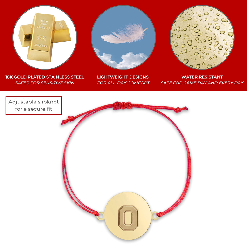 Elevate your style with our Ohio State University bracelet, exquisitely crafted with 18k gold plated stainless steel and a waxed cord band and meticulously designed to offer Ohio State Buckeyes elegance and durability. This stunning Ohio State bracelet is the perfect accessory for any occasion, blending timeless style with modern sophistication. Our Buckeyes Jewelry offers an adjustable design, ensuring a perfect fit for everyone and allowing you to choose a snug or loose fit according to your preference. This Ohio State bracelet is also great for stacking and layering! Made from high-quality 18k gold plated stainless steel and waxed cord, this bracelet is safe for sensitive skin, offering visual luxury without any irritation. Each Buckeyes bracelet is designed to maintain its shine and color with long-lasting beauty and durability. The sleek and elegant design makes it a versatile piece that complements any outfit and especially Ohio State Buckeyes Apparel; from casual to formal wear to Ohio State Buckeyes Football Gamedays, showcase your Ohio State Buckeyes pride. Featuring a secure bolo-style closure, you can wear your bracelet with confidence, knowing it will stay in place all day long. This adjustable cord bracelet captures the spirit and tradition of Ohio State University with the iconic block O coin. Ready to gift, our OSU jewelry comes in beautiful, elegant packaging with a bow, making perfect Buckeyes Gifts for women, Ohio State Birthday Gifts, Graduation Gifts, Ohio State Alumni Gifts, back-to-school, or anyone that is an Ohio State University fan. Enjoy the ease of maintaining your bracelet with simple cleaning, ensuring it remains radiant and beautiful for years to come. With its classic design, this Ohio State bracelet transcends trends, offering a timeless piece that you'll cherish forever. Let's Go Bucks!