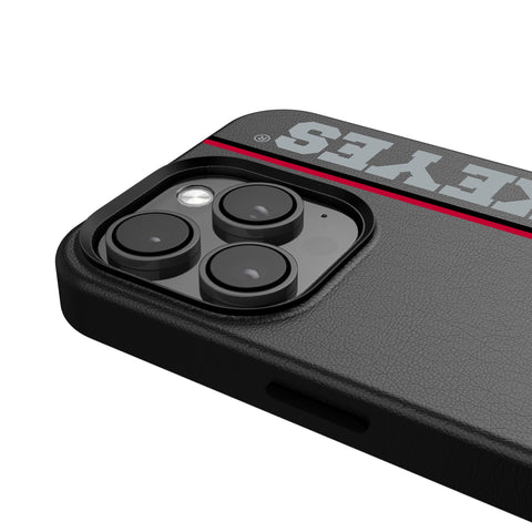 This premium black leatherette case sports an officially-licensed design and is MagSafe compatible. Designed and decorated by Keyscaper in Tualatin, Oregon, USA., this stylish cell phone case is a great way to show off your true fandom. Striking a great balance between bulk and protection, it is durable, has precise speaker and port cutouts, and is compatible with wireless charging devices.