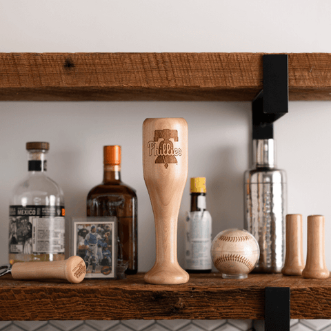 The Philadelphia Phillies Wined Up- a mini baseball bat wine glass. This 100% birch wood mini baseball bat is perfect to sip from on the patio, sitting poolside, while watching the "big game", or even tailgating.