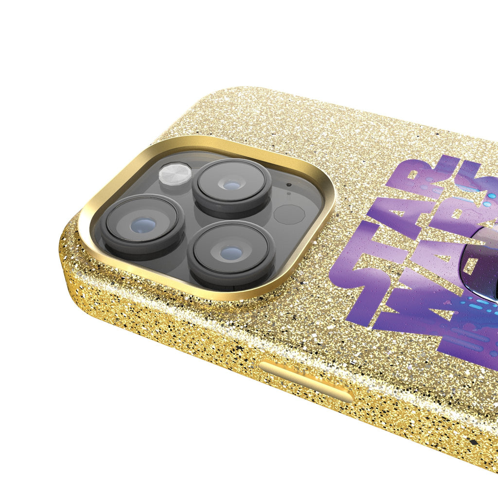 This gold, sparkly case with a microfiber interior is officially-licensed and MagSafe compatible. It provides fun and protection to your cell phone. Designed and decorated by Keyscaper in Tualatin, Oregon, USA., this case is exciting and durable. It has precise speaker and port cutouts, easy press buttons, and a raised lip around the screen and camera lens to provide extra protection against accidental bumps and scratches.