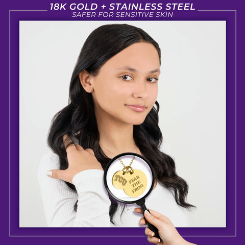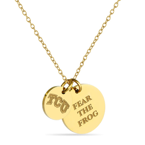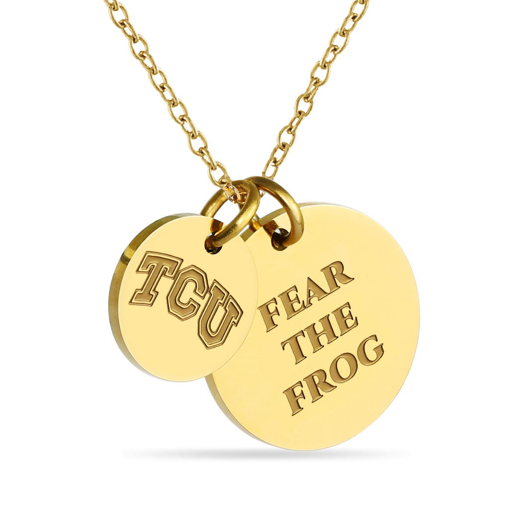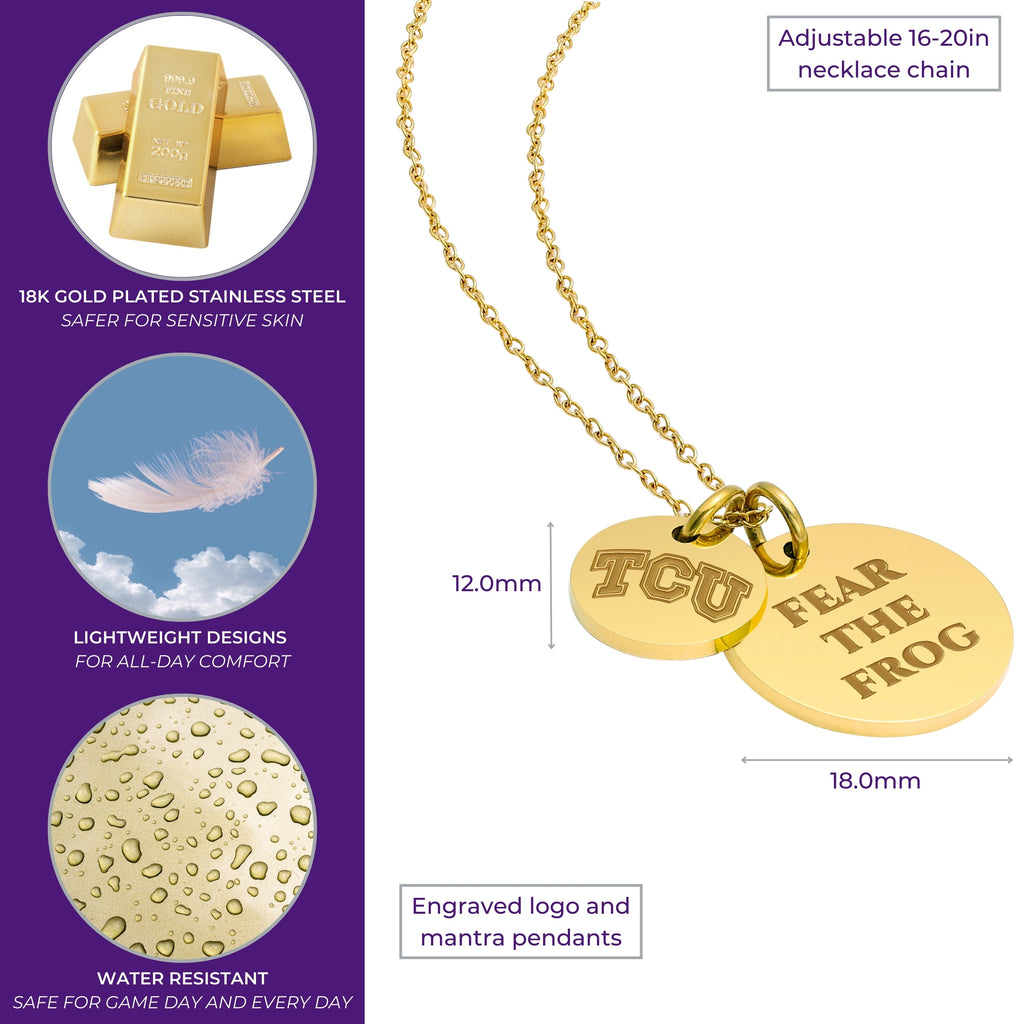 Proudly display your TCU Horned Frogs pride with this officially licensed TCU necklace, featuring two gold-plated pendants engraved with the iconic Block TCU and the inspiring mantra, 'Fear the Frog This pendant necklace, made from surgical-grade stainless steel and coated in 18K gold, offers both durability and elegance. Its adjustable length (16-20 inches) makes it perfect for everyday wear or TCU game day. Whether you're attending a game or gifting it for a special occasion, this necklace is ideal for TCU fans, students, and alumni. It makes a thoughtful present for birthdays, Mother’s Day, graduations, Christmas, any other celebration. Packaged simply yet beautifully, this necklace arrives ready for gifting, ensuring it will delight any TCU fan