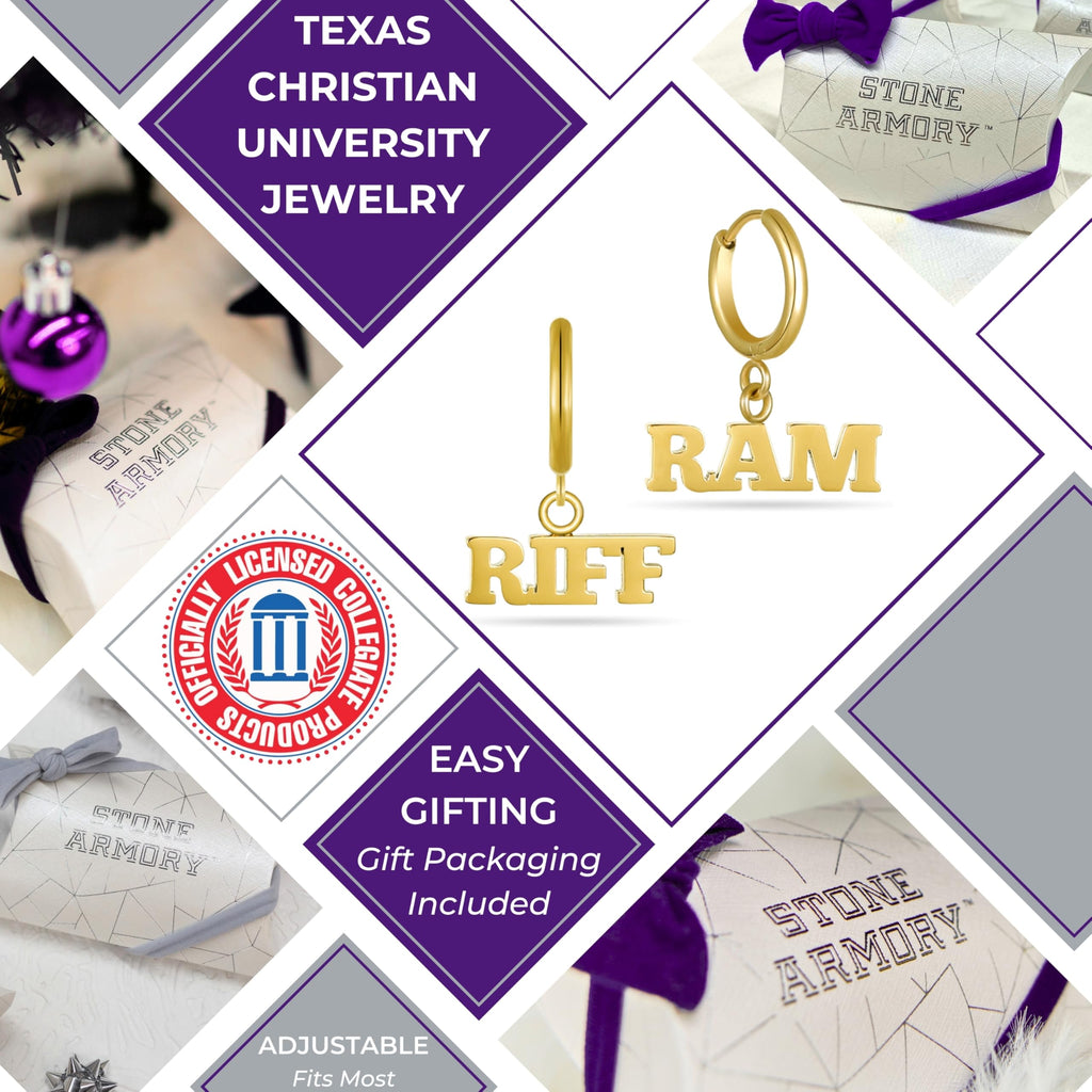- Express Your TCU Pride: These officially licensed Stone Armory Texas Christian University earrings feature a sleek Riff Ram design. Perfect for both game day and casual wear, these stainless steel earrings are an excellent way to showcase your Horned Frog spirit