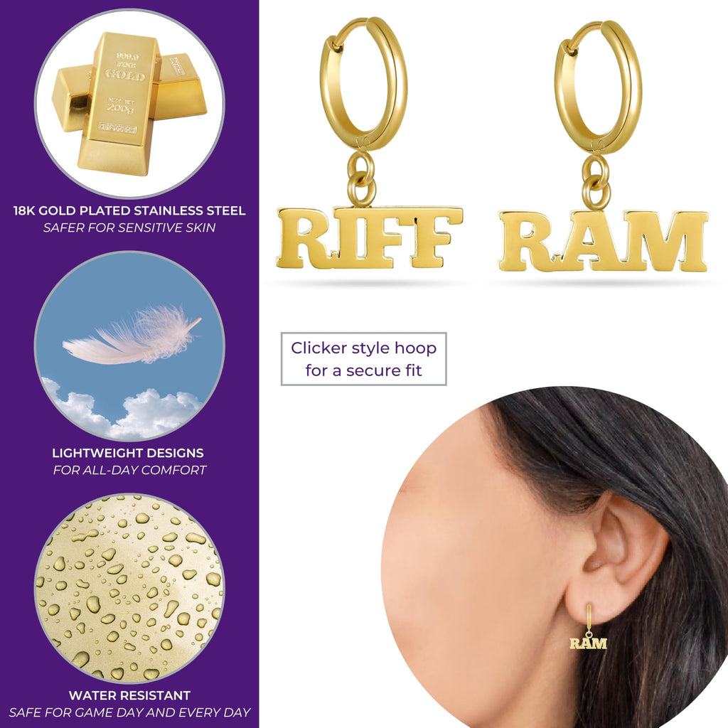 Stone Armory's TCU Riff Ram Huggie Hoop Earrings are Here Gear up for the game with these TCU Horned Frogs huggie hoop earrings, featuring a Riff Ram design. Perfect for tailgates or casual outings, these earrings let you proudly display your Texas Christian University spirit wherever you go. Crafted from stainless steel, these lightweight earrings are designed for sensitive ears, providing all-day comfort. They make an ideal gift for women, students, graduates, and TCU fans. Celebrate TCU graduation, birthdays, Mother's Day, the first day of school, or wear them to the first game and beyond. Add these versatile earrings to your TCU fan wear collection for everyday style. Thank you for supporting our small business with this officially licensed TCU jewelry.