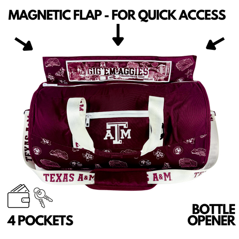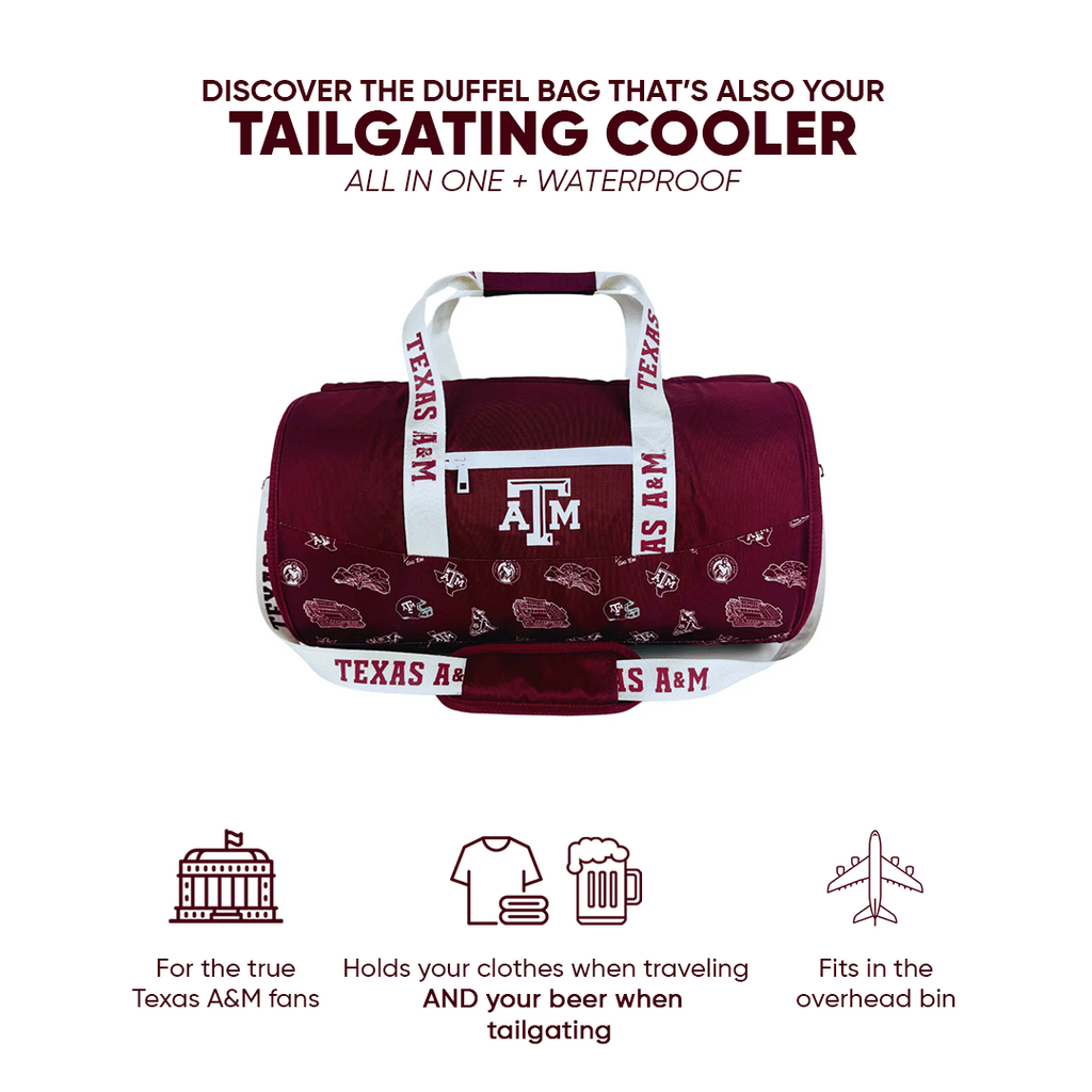 Celebrate the spirit of Aggieland with this officially licensed Texas A&M duffel cooler—crafted to hold 30 cans, retain ice for 18 hours, and travel in style.
