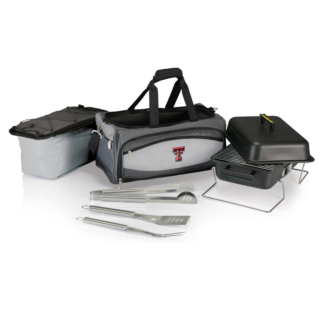 Picnic Time is proud to introduce our patented Texas Tech Red Raiders Buccaneer Portable Charcoal Grill & Cooler Tote, a travel grill set and insulated cooler in one! A 24-can capacity, fully-removable cooler nestles securely into the main compartment which holds the bbq grill and lid, and an exterior zip-up compartment holds three stainless steel grilling tools with aluminum handles and non-slip thumb grips including: one large spatula with an integrated bottle opener, one bbq fork, and tongs. With an adjustable shoulder strap with comfort pad, a reinforced waterproof base, three large zippered exterior pockets to store personal effects, padded carry handles, and a stretch cargo cord on the top of the tote to carry a blanket or towel, you'll win the tailgate party, hands down!